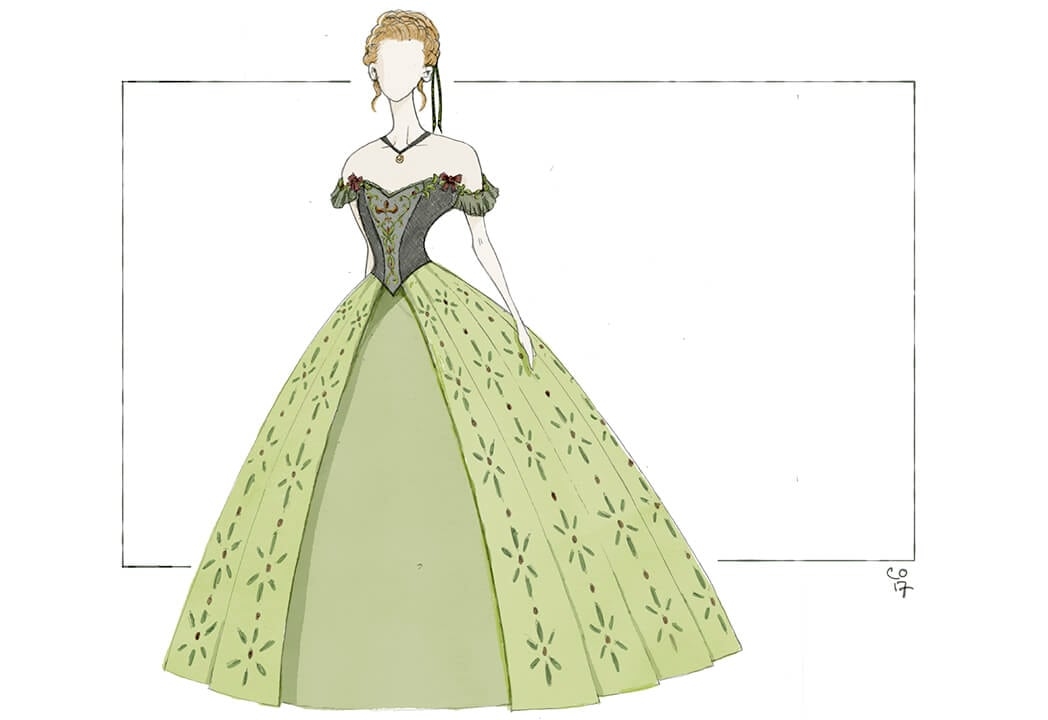 Inspired by the animated feature film, traditional Norwegian dress and historical fashion, this rendering of Anna’s coronation gown by Scenic and Costume Designer Christopher Oram is used to communicate the colours, shape, and style of the design to the team.